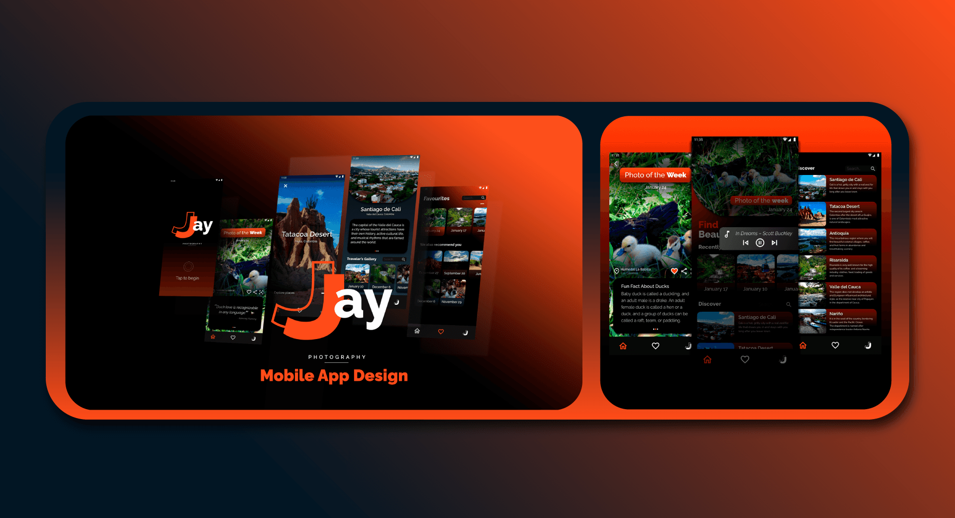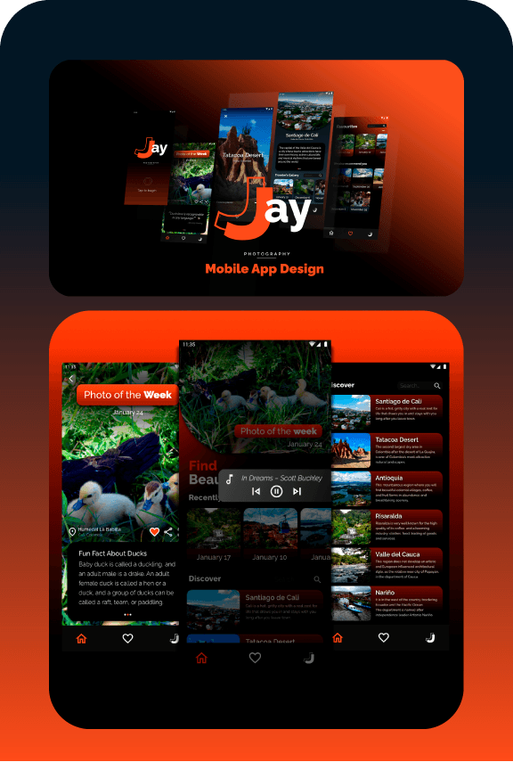 Diseño de un prototipo de aplicación móvil para mi cuenta de fotografía: @jjay12photos. La app está pensada para ofrecer una experiencia inmersiva a los amantes de la fotografía urbana y natural, facilitando la navegación entre galerías, stories, datos técnicos y ubicación de tomas destacadas. Cada pantalla fue diseñada con un enfoque visual limpio, resaltando los detalles de cada imagen y manteniendo coherencia con la identidad estética de la cuenta.