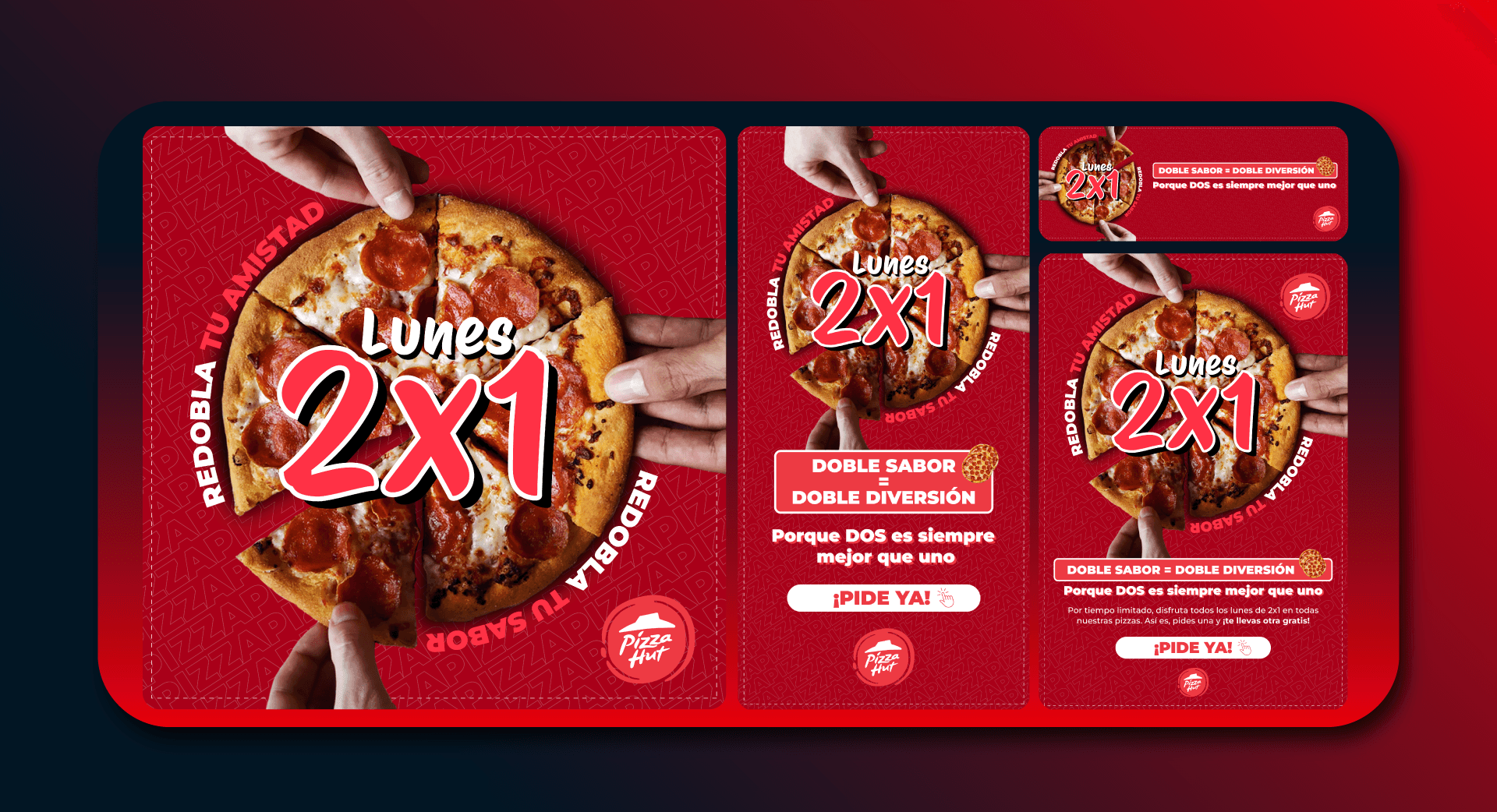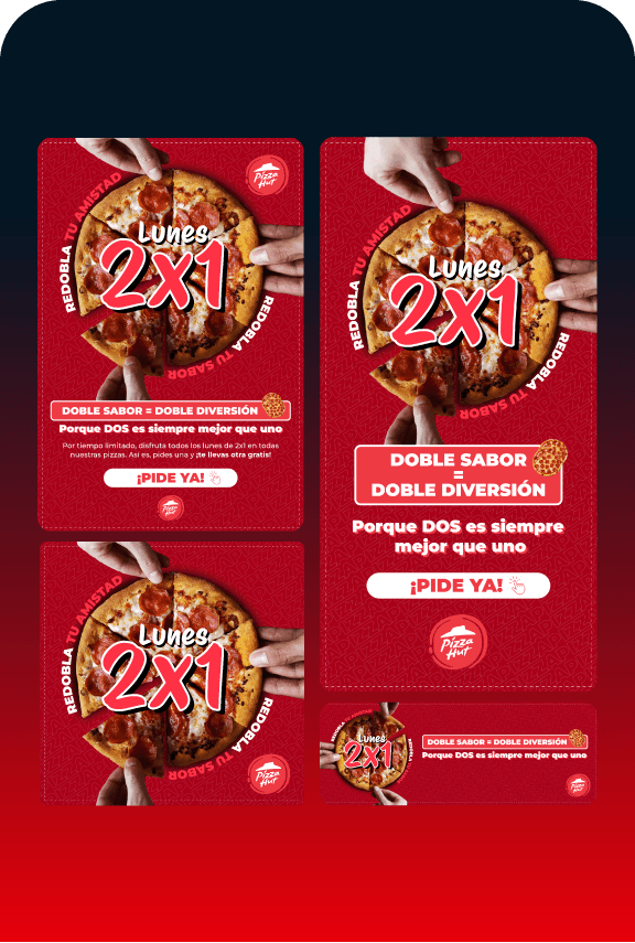 Desarrollo de piezas gráficas para redes sociales de Pizza Hut Cali, basadas en su key visual oficial.