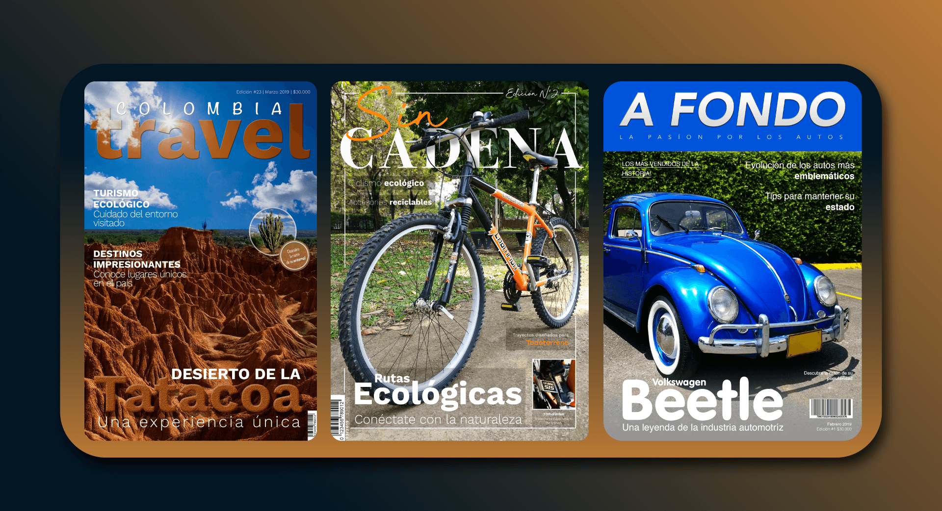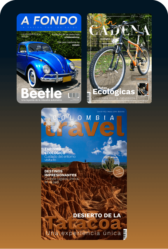 Serie de portadas desarrolladas para los proyectos: Colombia Travel, Sin Cadena y A Fondo. Cada diseño responde a una identidad visual única, creada con un enfoque estratégico y narrativo para conectar con su propósito y audiencia. Se trabajó la composición, selección tipográfica y dirección visual para representar conceptos clave como explotación, libertad y profundidad de contenido.